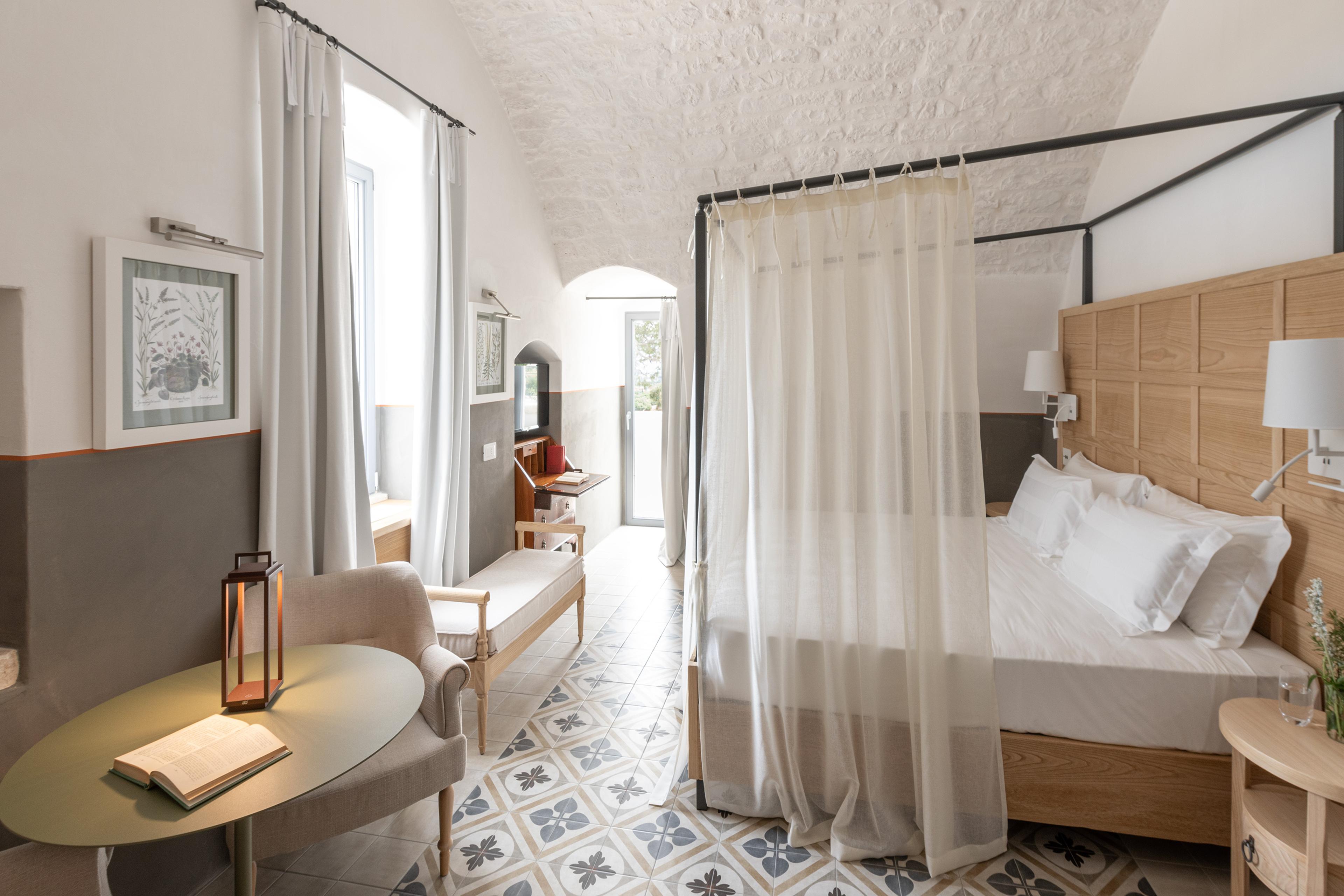 Alle 22 kamers van het hotel beschikken over dezelfde serene stijl met comfortabele bedden, modern designmeubilair en luxe badkamers. Toch zijn ze stuk voor stuk uniek en net iets anders ingericht. Ben je op zoek naar wat extra romantiek? In de voormalige schapenstallen vind je de 'pool garden kamers'. Deze beschikken over een eigen terras met outdoor plunge pool, uitkijkend over de heuvels van het Pugliaanse platteland. Maar ook de andere kamers en suites zijn niet te missen, sommige beschikken over een Hammam en anderen over een panoramisch terras waarbij je in de verte de zee blauw ziet kleuren.