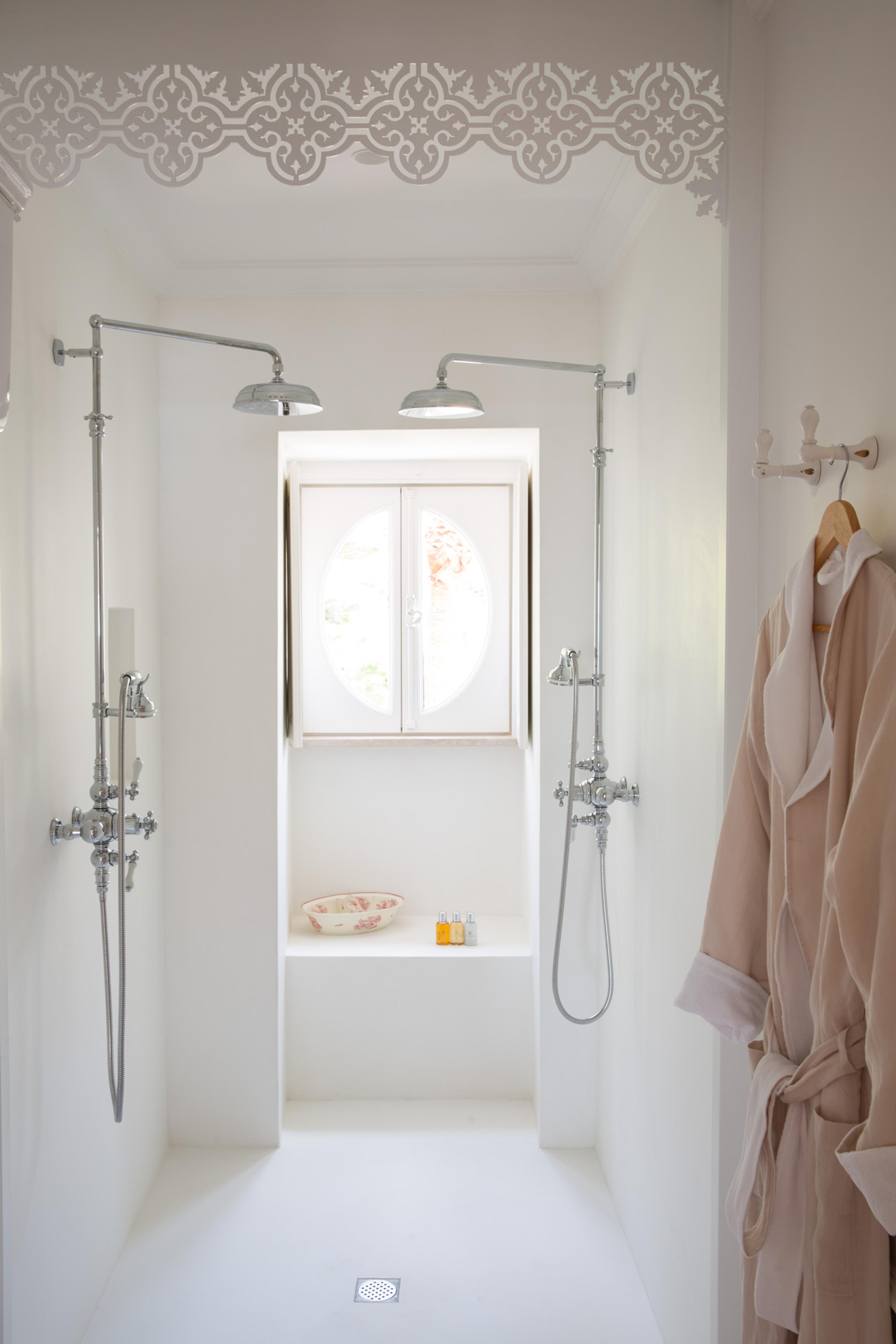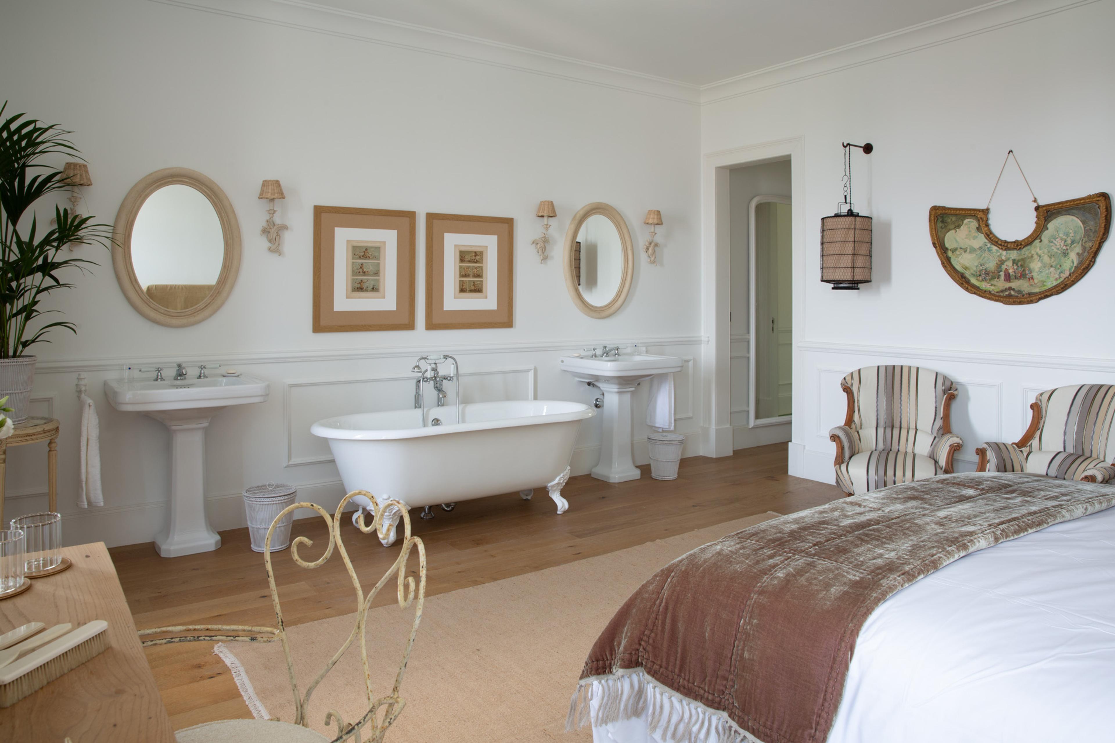 De kamers en suites variëren van compact en sfeervol tot royaal met hoge plafonds en openslaande deuren naar een balkon of terras. Sommige badkamers hebben een vrijstaand bad, andere een ruime inloopdouche in marmer en natuursteen. De inrichting is kleinschalig en liefdevol, alsof je verblijft in een stijlvolle residentie waar comfort en elegantie vanzelfsprekend zijn.